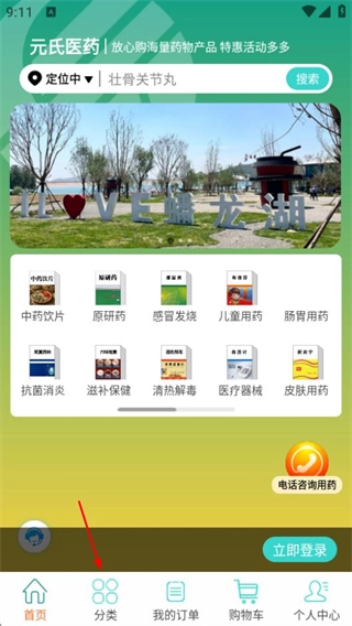 1、在元氏医药首页,点击底部分类选项,进入分类页面。