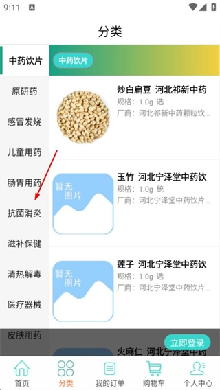 2、在分类页面,选择药品分类,如抗菌消炎,进入对应药品列表页面。