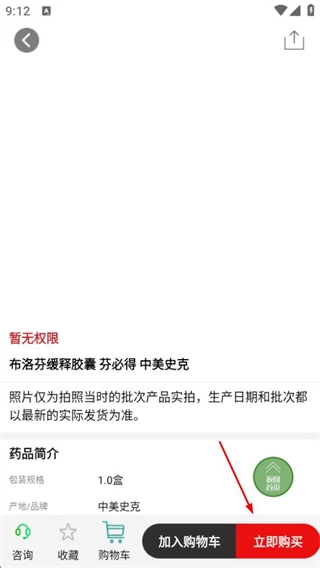4、在药品详情页面,点击立即购买按钮,可完成药品购买操作。